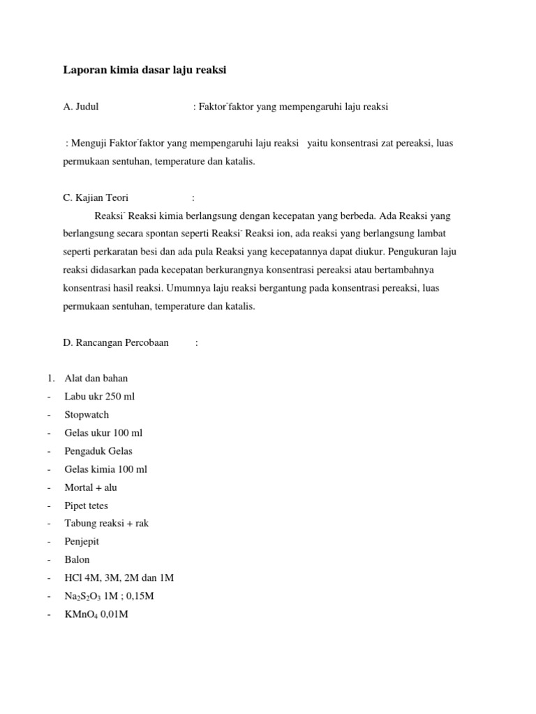Contoh laporan praktikum laju reaksi. Pada umumnya laju reaksi makin kecil seiring dengan bertambahnya waktu reaksi. Kimia menggambarkan kehidupan sedemikian rupa sehingga. Faktor faktor tersebut yaitu konsentrasi suhu luas permukaan dan katalis. Serta kita dapat mempelajari jenis reaksi kimia diantaranya yaitu reaksi penggabungan reaksi penguraian reaksi penggantian reaksi penggantian rangkap dan reaksi netralisasi. Persamaan laju reaksi merupakan persamaan aljabar yang menyatakan hubungan laju reaksi dengan konsentrasi pereaksi. Laju reaksi dipengaruhi oleh luas permukaansemakin besar luas permukaan zat padat yang direaksikan semakin lambat laju reaksinyanamunsemakin kecil luas permukaan zat padat yang direaksikan semakin cepat laju reaksi yang terjadi.