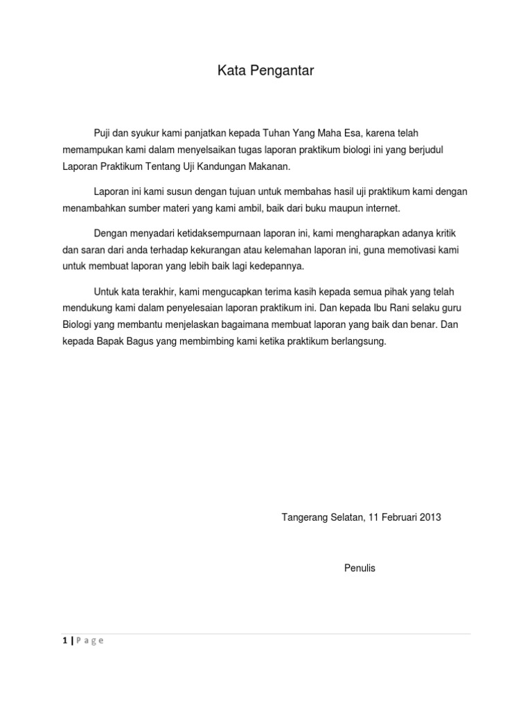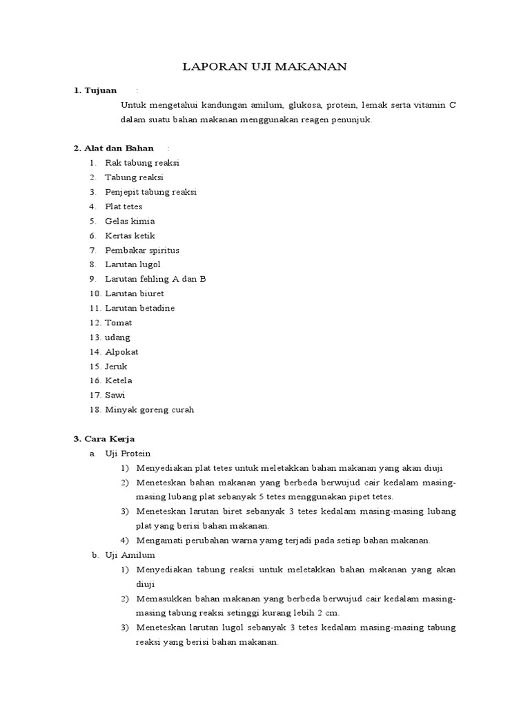 Demikian laporan praktikum biologi tentang uji kandungan zat pada makanan. Laporan praktikum uji makanan karbohidrat protein lemak dan glukosa posted on 1548by unknown with 12 comments. Ulasan tentang praktikum biologi uji makanan dapat disimak pada uraian di bawah. Contoh laporan uji makanan februari 1 2012 3 november 3 mengenai saya. Laporan praktikum biologi uji kandungan bahan makanan. Penulis mohon maaf apabila ada kesalahan dalam penulisan laporan ini.