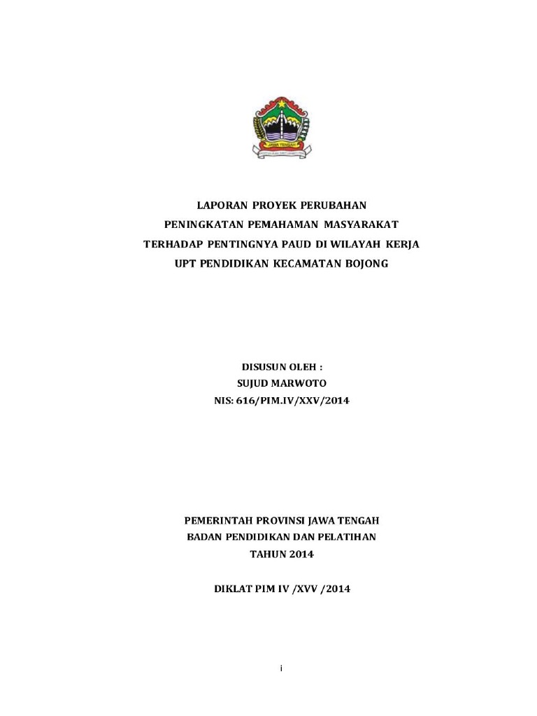 Contoh laporan proyek perubahan diklat pim iv pola baru. Sabtu 18 juni 2016 benchmarking pim iv pola. Optimalisasi system it pelayanan. Kegiatan proyek perubahan a. Begitulah yang dapat admin bagikan terkait contoh laporan proyek perubahan diklat pim 3 pola baru. Diharapkan dapat memberikan masukan dalam pengembangan ilmu pengetahuan dan sebagai pembanding para peserta diklat untuk menulis proyek perubahan. Menuju pemimpin perubahan filosofi dasar diklat pim pola baru adalah dapat menciptakan pemimpin perubahan.