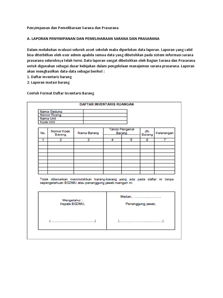 Pengawasan sarana dan prasarana merupakan kegiatan pengamatan pemerikasaan dan penilaian terhadap pelaksanaan administrasi sarana dan prasarana sekolah. Anda dapat melihat preview sebelum mendownload guna menghindari kesalahan. Laporan sarana dan prasarana kantor adalah suatu kegiatan yang bertujuan untuk melaporkan keadaan sarana dan prasarana kantor baik persediaan mutasi maupun keadaan fisik dari sarana dan prasarana tersebut dalam periode waktu tertentu triwulan semester atau setahun. Sarana dan prasarana pengertian menurut para ahli fungsi cara ruang lingkup contoh untuk pembahasan kali ini kami akan mengulas mengenai sarana dan prasarana yang dimana dalam hal ini meliputi pengertian menurut para ahli fungsi cara ruang lingkup dan contoh nah agar dapat lebih memahami dan dimengerti simak ulasan selengkapnya dibawah ini. Pemerintah menginginkan laporan yang sistematis dalam setiap administrasi dan pengadaan sarana dan prasaranamisalnya dalam renovasi gedung sekolah maka setelah diadakan renovasi sekolah membuat laporan terlutis lengkap mengenai renovasi sekolah yang ditujukan kepada instansi terkait sebagai laporan pertanggungjawaban sekolah. Syukur al hamdulillah kami panjatkan kehadirat allah swt yang telah memberikan rahmat dan dan karunia serta hidayah nya sehingga kami dapat menyelesaikan penulisan dan penyusunan laporan program kerja wakil kepala madrasah urusan sarana dan prasarana untuk periode januari sd juni 2012 yaitu semester genap tahun pelajaran 2011 2012.