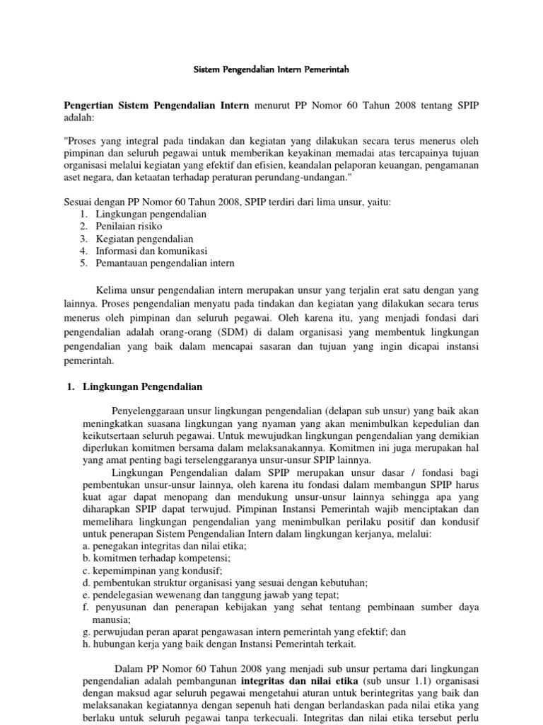 Pelaksanaan spip berdasarkan peraturan bupati kulon progo nomor 44 tahun 2011 tentang petunjuk pelaksanaan penyelenggaraan sistem pengendalian intern pemerintah di lingkungan pemerintah daerah maka satgas skpd wajib menyampaikan laporan penyelenggaraan spip kepada ketua satgas spip pemda dengan tembusan. Informasi dan komunikasi dan d. Rencana kegiatan pengendalian sedangkan untuk c. Latar belakang eraturan pemerintah nomor 60 tahun 2008 pp nomor 60 tahun 2008 tentang sistem pengendalian intern pemerintah spip telah memberikan amanat kepada setiap instansi pemerintah untuk menyelenggarakan spip di lingkungan organisasinya masing masing. Maksud dan tujuan petunjuk pelaksanaan penyelenggaraan spip kabupaten batang ini disusun dengan maksud untuk dijadikan pedoman bagi pimpinan dan.