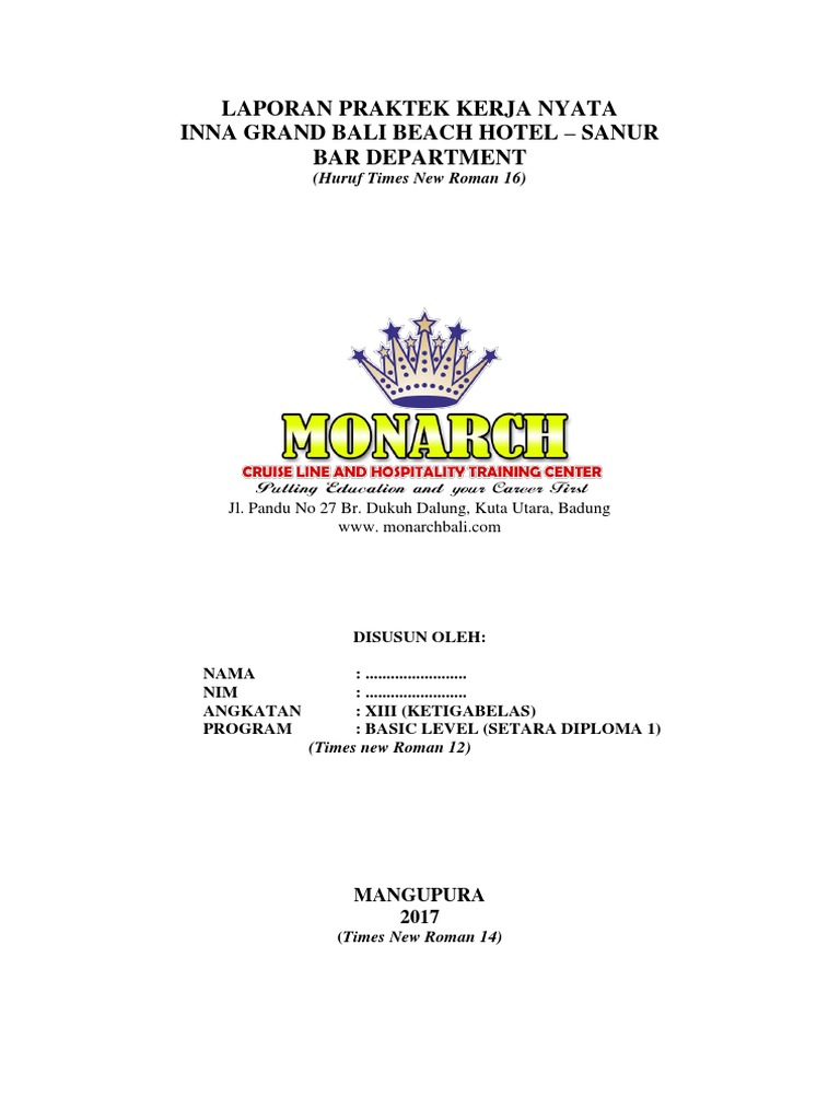 Puji syukur penulis panjatkan kepada tuhan yang maha esa karena atas berkat rahmat nya penulis dapat menyelesaikan on the job training dengan baik dan tepat pada waktunyadalam menyusun laporan inipenulis membuamya sesuai dengan kemampuan sendiri berdasarkan apa saja yang telah dilakukan dalam on the job training di hotel baleka resort spa legian kuta bali. Langsung dengan pantai jimbaran dan dilengkapi dengan tempat berjemur dan salah satu residence dijadikan sebagai kitchen. Laporan ini dibuat sebagai syarat untuk melengkapi dan mendapatkan nilai praktek industri yang telah dilakukan dari 2 juni 2 oktober 2015. Contoh laporan training hotel bab 1. Puja dan puji syukur penulis panjatkan kehadapan ida shang hyang widhi wasa karena berkat rahmat serta karunia nya penulis dapat menyelesaikan laporan on the job training tepat pada waktunya. Laporan ini dibuat dengan tujuan agar nantinya dapat dijadikan bahan sejauh mana hasil yang telah didapat selama mengikuti on the job trainee di hotel tamukami.
