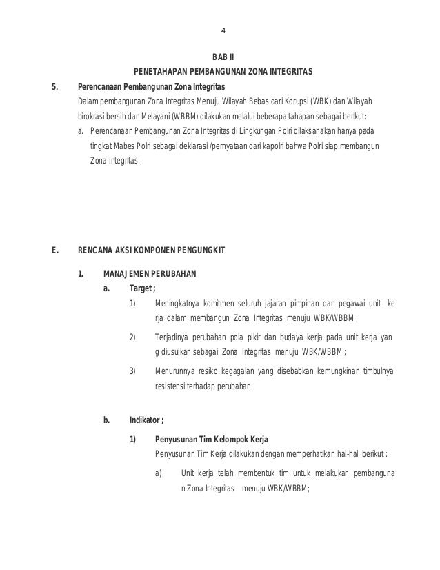 Ruang lingkup zona integritas 4. Permenpan nomor 52 tahun 2014 tentang pedoman pembangunan zona integritas menuju wilayah bebas dari korupsi dan wilayah birokrasi bersih dan melayani di lingkungan instansi pemerintah. Zona integritas atau disingkat dengan zi merupakan predikat yang diberikan kepada instansi pemerintah yang pimpinan dan jajarannya mempunyai komitmen untuk mewujudkan wbkwbbm melalui reformasi birokrasi khususnya dalam hal pencegahan korupsi dan peningkatan kualitas pelayanan publikâ predikat tersebut didapat dengan melalui beberapa tahapan dalam pembangunan zona integritas. Matrik monitoring evaluasi pembangunan zona integritas menuju wbkwbbm di lingkungan bpspl denpasar bulan januari terlampir. Penataan sistem manejemen sdm 4. Laporan tahunan pengadilan negeri mempawah tahun 2018.