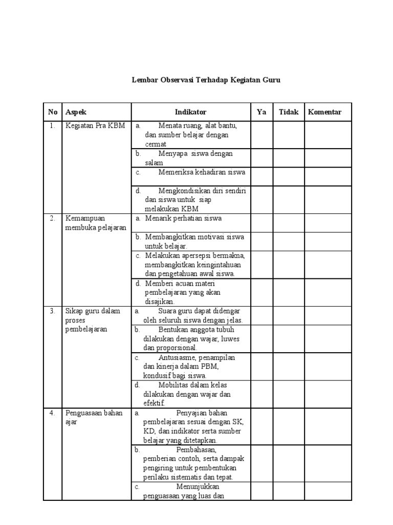 Contoh lembar observasi guru. Contoh instrumen ptk lembar observasi aktivitas guru setelah menerbitkan tulisan mengenai contoh lembar observasi aktivitas siswa dalam pembelajaran menulismengarang kali ini kembali blog penelitian tindakan kelas akan memberikan contoh lembar observasi yaitu lembar observasi aktivitas guru dalam pembelajaran. 10 memberi contoh konkrit dalam kejadian yang ada dalam kehidupan sesuai dengan yang diperagakan 11 memberikan motivasi dan penguatan c penutup 1 membimbing siswa menyimpulkan materi 2 mengaitkan materi dengan pelajaran yang akan datang. Lembar observasi aktivitas guru lembar observasi pembelajaran. Cara membuat lembar observasi ptk banyak guru terhambat saat ingin melakukan penelitian tindakan kelas karena ketiadaan instrumen penggali data yang sesuai dengan fokus atau tujuan penelitian tindakan kelas yang akan mereka lakukan. Skripsi perilaku pemberian asi oleh ibu dengan usia di bawah 20 contoh penelitian yang relevan kerangka berpikir dan model hipotetik dalam skripsi. Seperti yang sudah sudah sebelum instrumen ptk tersebut di atas ditampilkan.