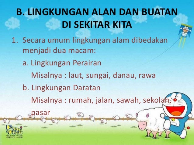 Baik itu manusia hewan tumbuhan dan juga benda mati lain yang ada pada suatu tempat tersebut. Murid murid kelas iii dibimbing oleh bu farida menuju halaman belakang sekolah. Selain lingkungan alam ada pula lingkungan buatan. Sekarang ini pun kamu tinggal di lingkungan. Lingkungan alam dan buatan di sekitar sekolah. Macam macam lingkungan hidup alami dan buatan seperti yang kita ketahui sebelumnya.