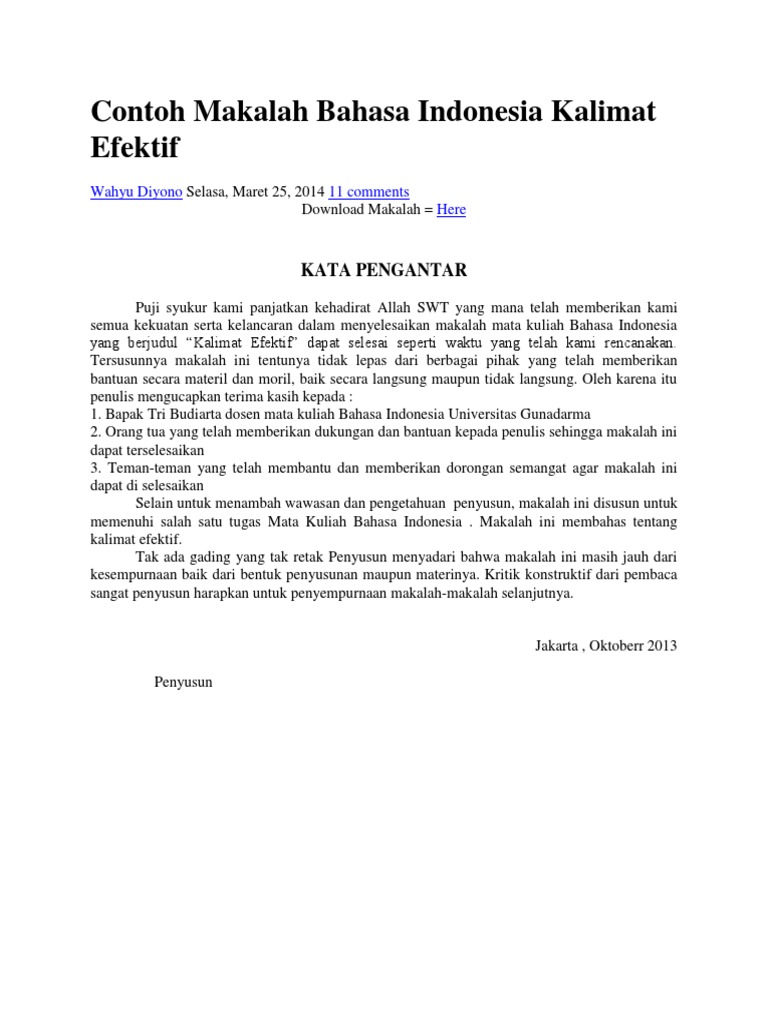 Kalimat berisi tentang ide dan gagasan penulis atau pembicara. Sebelumnya contoh makalah bahasa indonesia. Kalimat efektif adalah kalimat yang disusun berdasarkan kaidah kaidah yang berlaku seperti unsur unsur penting yang harus dimiliki setiap kalimat subjek dan predikat. Kalimat efektif pada pembahasan materi kali ini adalah tentang pengertian contoh syarat dan ciri ciri kalimat efektif silahkan kalian simak penjelasan singkat dibawah ini. Berikut ini adalah posting tentang contoh makalah bahasa indonesia yang membahas tentang kalimat efektif. Kesenyapan bunyi pada awal kalimat biasanya berupa penggunaan huruf kapital.