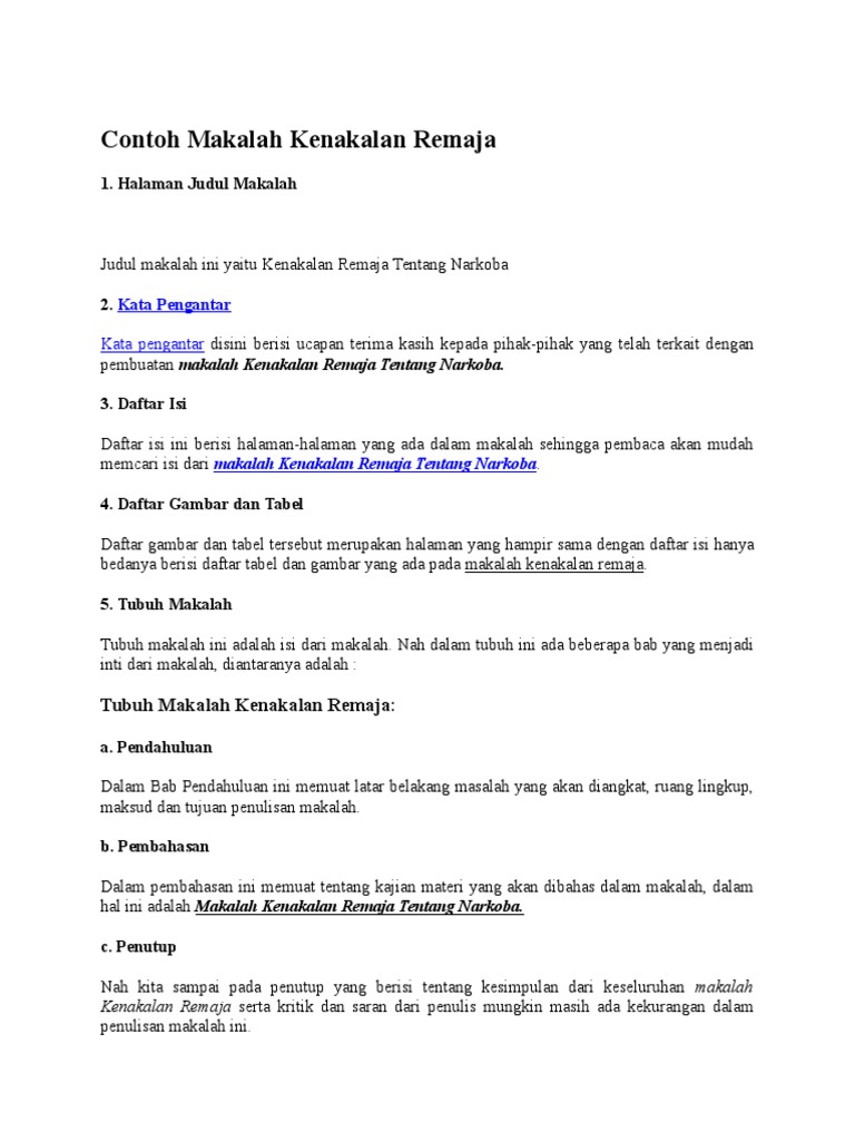 Contoh makalah kenakalan remaja. Pengertian kenakalan remaja adalah suatu bentuk aktivitas kegiatan ataupun perbuatan yang melanggar norma ketentuan dan peraturan hukum. Pengertian ciri contoh penyebab dan solusinya lengkap dalam kehidupan sehari hari kita sering sekali melihat kenakalan remaja misalnya tawuran antar sekolah tawuran antar sekolah merupakan salah satu dari kenakalan remajapada kesempatan kali ini disini akan mengulas tentang kenakalan remaja secara lengkap. Makalah kenakalan remaja by iepunks 1216 am 5 comments buat agan agan yang lagi butuh contoh makalah tentang kenakalan remaja mungkin posting kali ini bisa membantu agan sekalian dalam menyelesaikan tugas sekolah dll. Semoga materi yang kami berikan dan jangan lupa juga untuk menyimak materi seputar makalah renaissance yang telah kami posting sebelumnya. Para remaja ini melakukan tindakan tersebut karena didorong berbagai faktor ditambah dengan adanya kesempatan. Perilaku kenakalan remaja saat ini sulit diatasi.