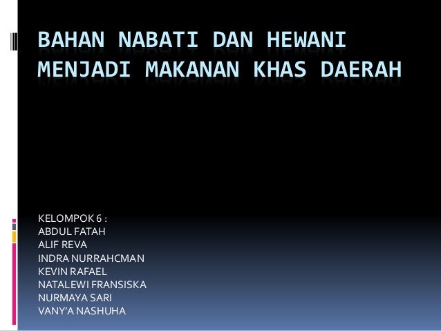 Mie ini salah satu makanan khas daerah aceh yang juga merupakan makanan khas indonesia. Makanan ini berasal dari daerah jepara. Produk nabati adalah makanan dengan cita rasa tertentu suatu daerah dengan bahan utama tumbuhan. Sedangkan bahan pangan hewani adalah bahan makanan yang berasal dan diolah dari hewan. Bandeng presto adalah makanan khas indonesia yang berasal dari kota semarang jawa tengahmakanan ini dibuat dari ikan bandeng chanos chanos yang dibumbui dengan bawang putih kunyit dan garam. Makanan awetan merupakan pengolahan bahan makanan yang menghasilkan makanan yang memiliki daya simpan yang lama.