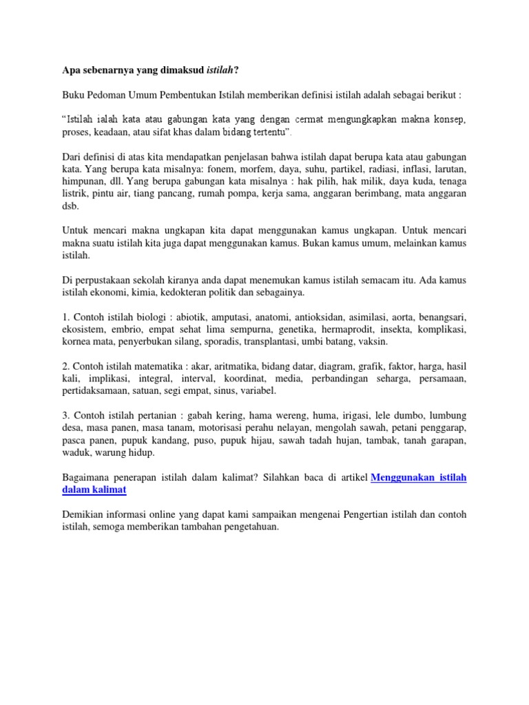 Contoh makna kata dan makna istilah. Meski awalnya ia menolak akhirnya dudi bersedia untuk menjalani operasi untuk melakukan proses amputasi pada kaki sebelah kanannya. Namun karena frekuensi penggunaan kata akomodasi sebagai istilah bidang pariwisata lebih tinggi daripada dalam bidang pelistrikan. Suatu istilah berhubungan dengan pengungkapan makna konsep proses serta keadaan atau sifat di bidang tertentu. Amputasi proses pemotongan bagian tubuh. Ini lah arti kata yang menunjukkan arti yang sebenarnya aktual dari suatu objek peristiwa objek dan sebagainya. Pengertian dan contoh dari kedua jenis istilah ini sebagai berikut.