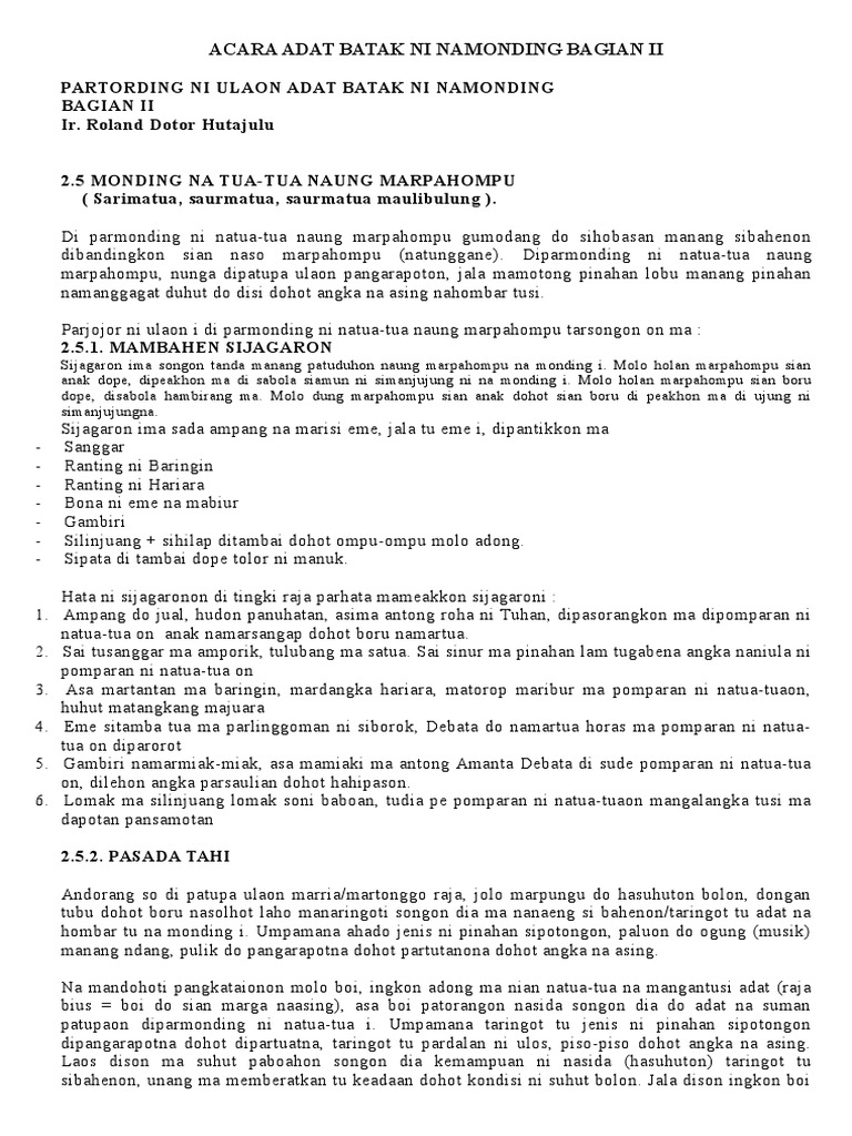 Hata di na pasahathon ulos pansamot sian amang ni boru muli. Jala naeng ma suarana torang boi dibege sude natorop i. Godang do na mambahen sasahalak gabe muruk. Dung sidung marsipanganon ndada pola adong namarsisean songon angka di ulaon adat na somal alai pintor di pungka ma na mandok hata apul apul tu na marsitaonon i. Dison pe inang na ro do hami sian parhalado ni hurianta ima napasahanton hata pangapulon tu ina nami nang tu sude keluarga na adong di inganan on. Andorang so dihatahon natua tua i hata ni pinggan pangarapoton dohot hata pasu pasu tu pinompar ni na monding i parjolo ma di sungkun tu sude naliat nalolo manang adong sian nasida nanaeng mandok hata siala singir dohot utang ruji ruji dohot dabu dabu ni na monding i.