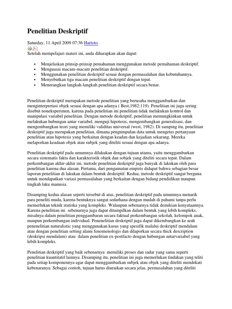 Contoh metode penelitian deskriptif. Deskriptif adalah metode yang dengannya. Metode penelitian kualitatif saat anda mengijak perguruan tinggi dan menginjak semester akhir biasanya akan di beri tugas untuk membuat karya penelitian nah salah satunya adalah penelitian kualitatif ini untuk mempermudah anda dalam mencari referensi berikut adalah pembahasa lengkap mengenai metode penelitian kualitatif serta contoh dan pembahasannya. Jenis metode penelitian setelah metode deskripsi adalah metode korelasional. Bebicara mengenai kondisi tersebut setidaknya pada artikel ini akan mengulas lebih dalam tentang pengertian motode dan contoh penelitian deskriptif. Menurut whintney 1960 metode deskriptif adalah pencarian fakta dengan interpretasi yang tepat. Metode penelitian deskriptif bertujuan untuk menggambarkan menjelaskan dan memvalidasi fenomena sosial yang menjadi subjek penelitianmetode penelitian deskriptif adalah penelitian naratif yang digunakan dalam proyek penelitian kualitatif atau kualitatif.