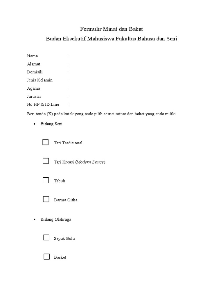 Untuk info lebih lanjut silakan hubungi dewa ardinata 08983141246. Program minat bakat dan kegemaran bertujuan untuk meningkatkan kemampuan mahasiswa dalam manajemen praktis berorganisasi menumbuhkan apresiasi terhadap olahraga dan seni kepramukaan belanegara cinta alam dan jurnalistik. Pendidikancoid pada kesempatan ini kita akan membahas mengenai minat adapun penjelasannya sebagai berikut. Formulir akademik minat dan bakat mahasiswa. Contoh angket minat belajar mahasiswa. Pengertian bakat macam jenis dan contoh bakat bakat adalah kemampuan yang memang sudah melekat dan dimiliki oleh setiap orang yang bisa digunakan dalam mempelajari sesuatu hal dengan cepat dan bahkan beberapa diantaranya bisa mempelajari dalam waktu singkat serta mendapatkan hasil yang sangat baik pula.