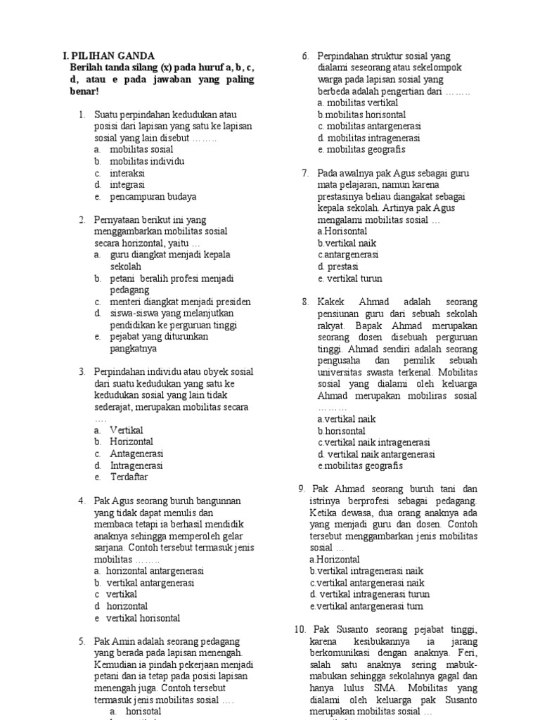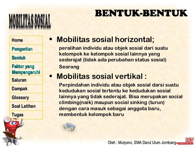 Contoh mobilitas vertikal dan horizontal. Mobilitas sosial horizontal adalah pergeseran posisi atau kedudukan seseorang yang tidak banyak membawa perubahan dalam kehidupan orang tersebut sedangkan mobilitas sosial vertikal terbagi lagi menjadi dua yaitu mobilitas sosial vertikal ke atas dan mobilitas vertikal ke bawah. Selain itu mobilitas vertikal dapat dibedakan menjadi mobilitas vertikal intragenerasi dan mobilitas vertikal antargenerasi. Setalah anda mengetahui apa saja contoh mobilitas sosial horizontal dan vertikal berikut ini ada beberapa contoh mobilitas sosial yang ada di lingkungan masyarakat. Salam sahabat pendidikan sekalian berikut adalah artikel singkat yang akan membahas mengenai pengertian dan bentuk betuk mobilitas sosial yang diharapkan mampu menjadi jawaban atau referensi untuk anda dalam proses belajar dimanapun berada betikut ulasannya. Seorang pekerja yang pindah perusahaan dengan pekerjaan yang sejenis contoh mobilitas sosial vertikal. Contoh mobilitas vertikal turun adalah sebelum wali kota kemudian menjadi warga masyarakat biasa lagi.
