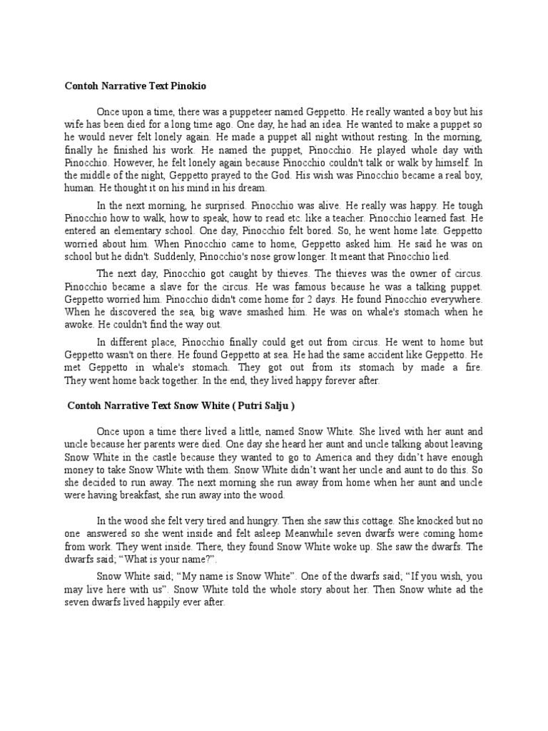 In the past there was a puppeteer whose name is geppetto. Kali ini kita akan membahas 21 lebih contoh narrative text yang ditulis dalam 2 bahasa lengkap dengan berbagai macam tema mulai dari narrative text singkat legend tentang malin kundang cinderella sampai fable tentang the and and the grasshopper. Contoh narrative text bahasa inggris narrative text adalah sebuah teks yang berisi sebuah cerita cerita terdahulu atau cerita karangan yang saling terhubung yang biasa nya untuk menghibur para pembaca nya narrative teks banyak jenis jenis nya diantaranya. Contoh narrative text panjang tentang pinokio lucu beserta artinya apakah ada diantara sahabat ibi yang berhidung seadanya alias pesek. Karena kepopuleran cerita pinokio ini kisahnya kerap dijadikan bahan narrative text untuk story telling dalam bahasa inggris di kalangan pelajar. He made a puppet all day long.