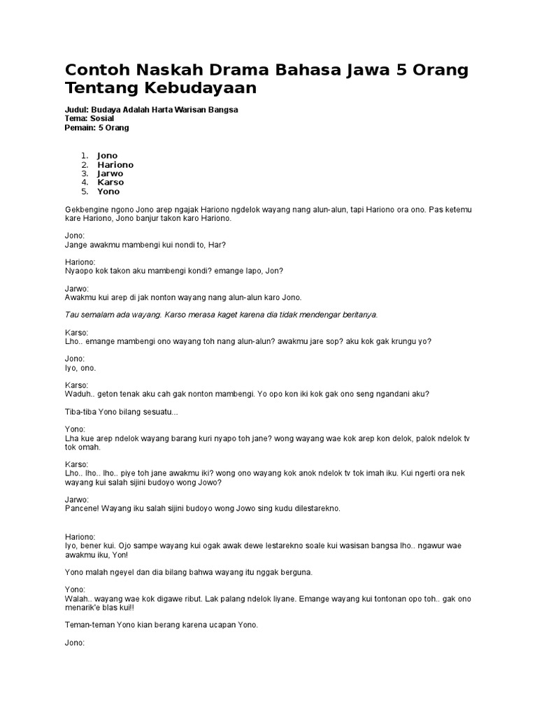 Drama singkat komedi lucu cerita rakyat bahasa jawa lengkap. Film pendek tema dramatis. Waluyo ialah teman septi icha. Berikut ini contoh dari naaskah derama 5 orangyang dapat aadmin ulas di bawah ini. Contoh naskah drama 5 orang. Ciri utama drama yaitu berupa cerita berbentuk dialog dan bertujuan untuk dipentaskan.