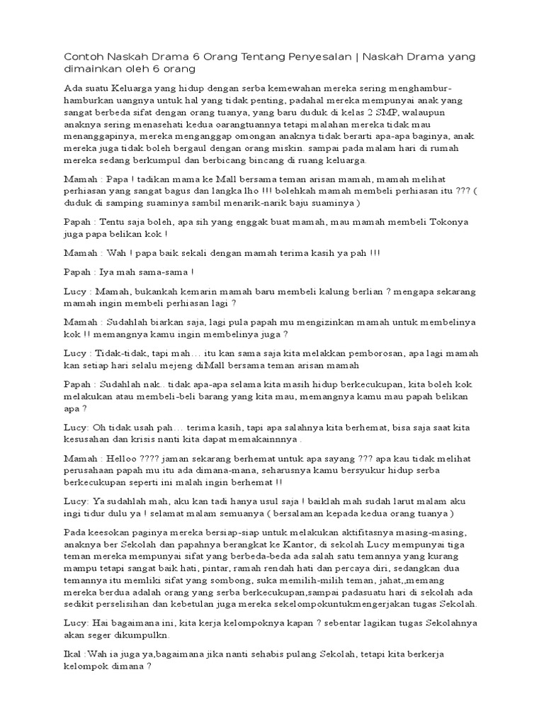 Contoh naskah drama 6 orang tentang penyesalan. Dalam artikel ini kita akan banyak mengulas tentang contoh naskah drama yang baik dan benar. Penyesalan ada suatu keluarga yang hidup dengan serba kemewahan mereka sering menghamburhamburkan uangnya untuk hal yang tidak penting padahal mereka mempunyai anak yang sangat berbeda sifat dengan orang tuanya yang baru duduk di kelas 2 smp walaupun anaknya sering menasehati kedua oarangtuannya tetapi. Ada suatu keluarga yang hidup dengan serba kemewahan mereka sering menghambur hamburkan uangnya untuk hal yang tidak penting padahal mereka mempunyai anak yang sangat berbeda sifat dengan orang tuanya yang baru duduk di kelas 2 smp walaupun anaknya sering menasehati kedua oarangtuannya tetapi malahan mereka tidak mau menanggapinya mereka menganggap omongan anaknya tidak berarti apa apa. Contoh naskah drama teater 6 orang tentang persahabatan di sekolah karena sahabat dalam kehidupan remaja sering ada pertikaian. Sya btuh naskah drama nih. Naskah drama yang berjudul hanya bisa menyesal ini melibatkan delapan orang pemain yang masing masing memiliki karakteristik atau sifat yang unik.