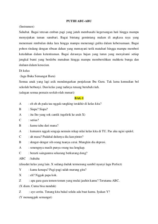 Contoh naskah drama musikal. Contoh naskah drama musikal sederhana persahabatan setting dibikin kayak ruang kelas. Contoh naskah drama singkat. Bagai bintang gemintang malam di angkasa raya yang menemani rembulan duka lara hingga mampu menerangi gulita dalam kebersamaan. Naskah drama musikal anak sma putih abu abu part 2 perbaikan dari part 1 lirik lagu daerah jawa tengah siji loro telu. Untuk 4 orang contoh naskah singkat drama anekdot 5 orang tentang persahabatan drama bahasa jawa komedi 5 orang drama musikal meraih mimpi naskah drama 10 orang tentang cita cita naskah drama 4 orang komedi. Kini tayangan pertunjukan drama sudah berkembang menjadi semakin modern dan beragam tidak seperti pada masa lalu.
