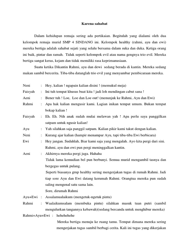 Contoh naskah drama persahabatan. Contoh naskah drama 5 orang belajar dan mencontek judul. Cerie coki cinderella canera. Sebuah kisah yang terjadi disebuah sekolahan yang sangat terkenal bernama growpee high school. Drama singkat komedi lucu cerita rakyat bahasa jawa lengkap. Persahabatan friendship karakter. Contoh naskah drama persahabatan enam orang sumber.