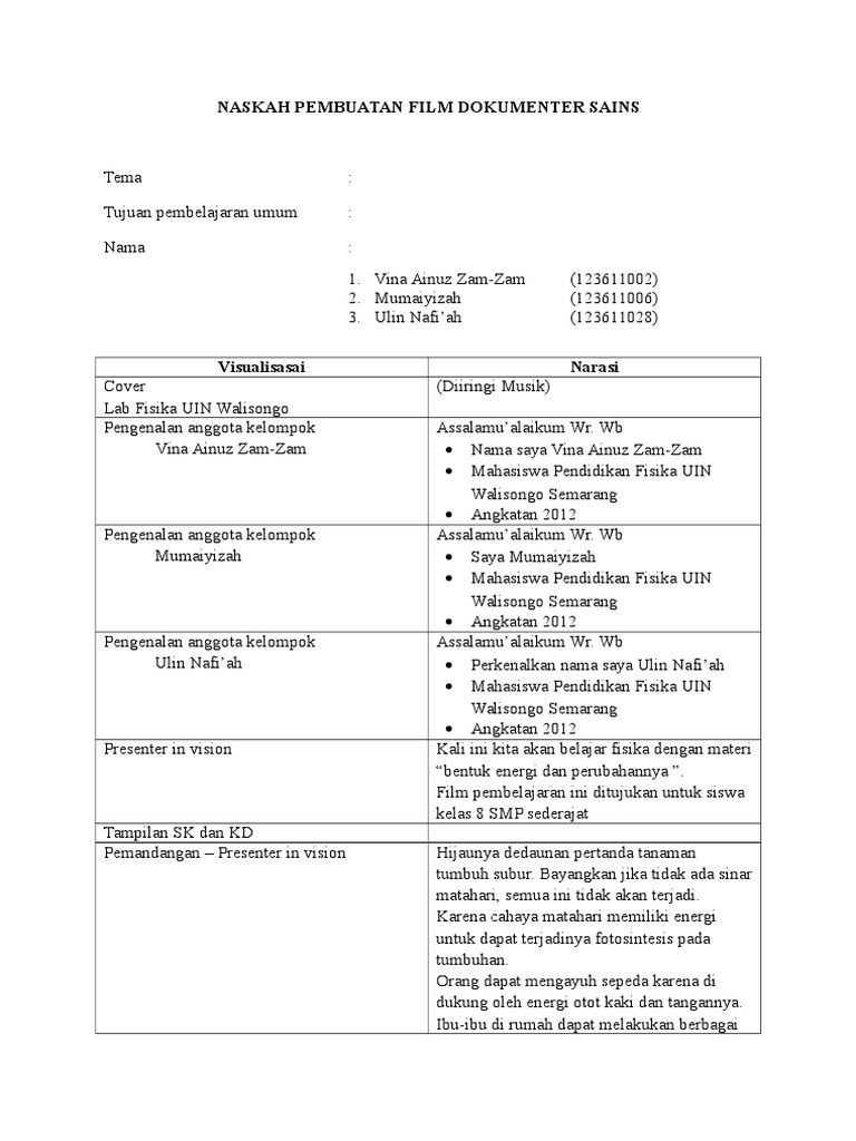 Contoh naskah film dokumenter. Contoh pembuatan skrip film dokumenter assalamualaikum wrwb. Adapun dalam proses pembuatan film maka memang harus dibuat terlebih dahulu skenarionya jadi bisa dikatakan skenario ini di buat pra produksi sebuah film. Detik akan menjadi beberapa menit bahkan menjadi hitungan jam untuk sekedar menyesuaikan nya. Contoh proposal film dokumenter. Di perancis istilah dokumenter digunakan untuk semua film non fiksi termasuk film mengenai perjalanan dan film pendidikan. Film dokumenter adalah film yang mendokumentasikan kenyataan.