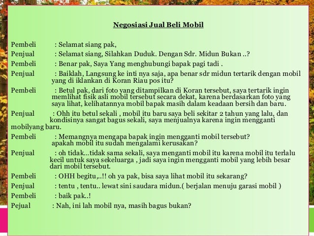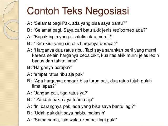 Contoh teks negosiasi jual beli. Contoh teks negosiasi jual beli beserta strukturnya negosiasi merupakan sebuah interaksi yang terjadi antara dua pihak yang mana pihak pihak yang terlibat memiliki tujuan untuk mencapai sebuah kesepakatan. Untuk lebih jelasnya tentang hal hal apa saja yang akan di bahas tentang teks negosiasi beserta ke tujuh belas lebih contohnya kamu bisa melihatnya dalam daftar isi.