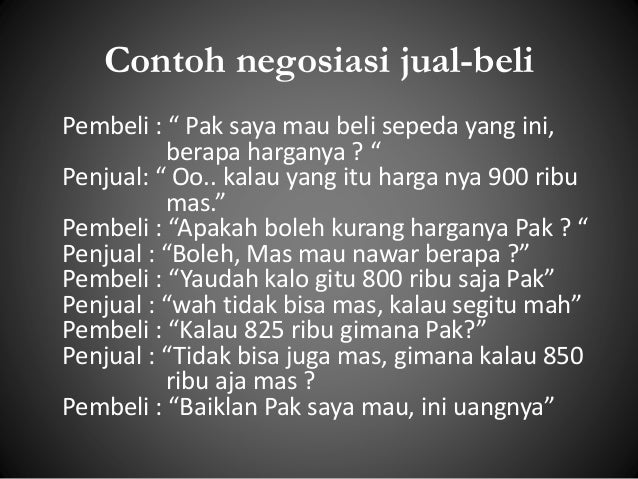 Tak hanya itu artikel ini juga menyediakan 17 lebih contoh teks negosiasi dengan berbagai pilihan tema seperti teks negosiasi jual beli pemecah konflik formal dan sebagainya. Selamat siang pak pak wardi. Di bawah ini adalah beberapa ungkapan yang bisa digunakan dalam proses jual beli. 15 contoh teks negosiasi jual beli singkat dalam berbagai kasus didalam sebuah obrolan terdapat istilah negosiasi antar personal dan hal yang dinegosiasikanpun bermacam macam dari yang terlihat sepele hingga serius atau yang formal ataupun yang tidak formal serta negosiasipun bisa dilakukan via pesan text pada sosial media atau via telfon dan bahkan secara langsung. Contohnya adalah dalam jual beli lingkungan masyarakat lingkungan keluarga lingkungan sekolah dan masih banyak lagi. Mau nawar berapa nak pembeli.
