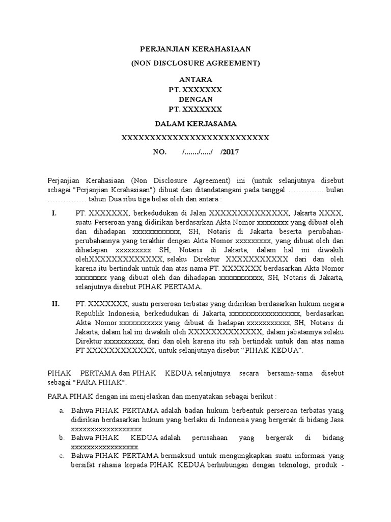 Prima inti karsa abadi pika a company incorporated under the laws of indonesia and having its registered office at. Protect your privacy with our free non disclosure agreement template. Surat non disclosure agreement atau yang biasa disingkat dengan nda adalah salah satu jenis dari surat perjanjian yang menyatakan bahwa seseorang tidak boleh melakukan pengutipan atau pemberitahuan isi dalam sebuah pekerjaan disclosure seperti yang tertera dalam surat perjanjian tersebutsecara ringkas surat non discolusre agreement memuat perjanjian yang menuyatakan bahwa seseorang diminta. Contoh profesi yang terikat non disclosure agreement. An example of a one way non disclosure agreement. Non disclosure agreement nda template sample.