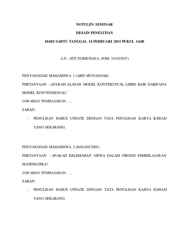 U pa y a. Notulanotulen rapat adalah ringkasan tentang jalannya rapat seminar diskusi atau sidang dan hal yang dibicarakan serta diputuskan dalam rapat tersebut dari awal acara sampai akhir acara. Adapun notulen jalannya acara seminar. Format notulen seminar ptk notulen jalannya acara seminar laporan hasil penelitian judul. Administrasi kegiatan seminar ptk terdiri dari surat undangan seminar panitia kegiatan seminar berita acara seminar daftar hadir peserta notulen laporan seminar foto foto kegiatan dan lain lain 4sarana penunjang kelancaran seminar tak lepas dari sarana penunjang seperti proyektor slide materi seminar media audiovideo. Contoh notulen seminar penelitian tindakan kelas yang bisa anda unduh secara gratis dengan menekan tombol download yang ada pada tautan dibawah ini.