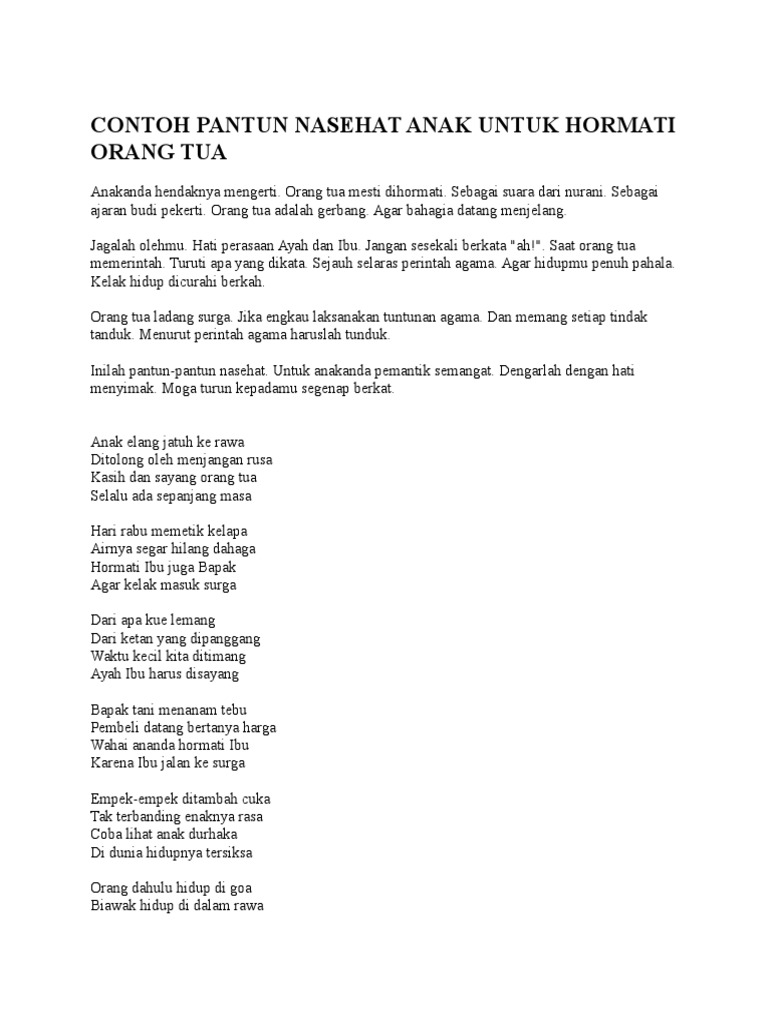 Contoh pantun nasehat orang tua berikut ini adalah pantun yang kerap digunakan orang tua untuk memberikan nasehat. Berikut ini contoh pantun nasehat. Khusus dalam artikel ini admin membahas mengenai pantun orangtua. Pantun nasehat lebih populer di kalangan orang melayu di indonesia dan juga negara tetangga malaysia. Pantun ini juga tersedia untuk semua kalangan seperti anak anakremaja dan bahkan dewasa. Contoh beberapa pantun yang bersisi nasihat dari orang tua adalah sebagai berikut.