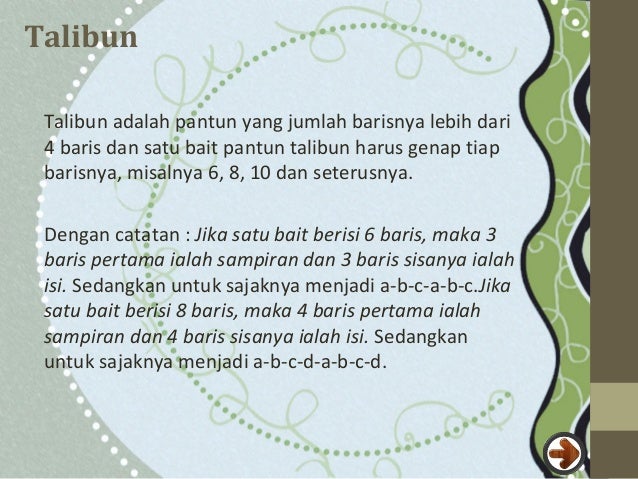 Pantun talibun merupakan bentuk puisi lama yang memiliki sampiran dan isi. Biasanya terdiri dari baris genap seperti 4 baris 6 baris 8 baris dan 10 baris.