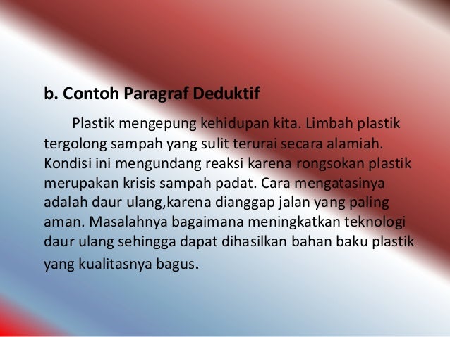 Contoh paragraf deduktif tentang lingkungan. Contoh paragraf deduktif tentang lingkungan. 5 contoh paragraf deduktif tentang lingkungan paragraf deduktif adalah paragraf yang gagasan utamanya terletak di awal paragraf yang termuat dalam kalimat utama yang berada di awal paragraf pula. Karena khusus di kesempatan hari ini admin akan mengupas tuntas tentang paragraf deduktif mulai dari pengertian dan contohnya sehingga semakin memudahkan kamu dalam mempelajarinya. Pada sebuah paragraf biasanya mempunyai suatu susunan yang diawali dengan kalimat utama kemudian akan disusul dengan kalimat pendukung atau penjelasannya. Paragraf deduktif merupakan sebuah paragraf yang kalimat utamanya berada di awal paragraf. Silahkan kalian simak penjelasan lengkapnya sebagai berikut.