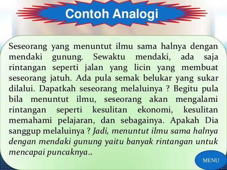 1 data yang dihasilkan oleh departemen transportasi menentukan peningkatan jumlah kecelakaan tahun ini dibandingkan dengan tahun sebelumnya. Generalisasi adalah penalaran induktif dengan cara menarik kesimpulan secara umum berdasarkan sejumlah data. Demam yang tinggi yang terjadi selama beberapa hari dapat dicurigai sebagai demam berdarah. Nah dalam paragraf induktif kalimat utama justru diletakan pada akhir paragraf yang mana umumnya kalimat utamanya adalah sebuah kesimpulan. Paragraf ini adalah berbanding terbalik dengan paragraf generalisasi loncatan induktif. Seseorang yang menderita demam berdarah juga mengalami pendarahan dari lubang hidung atau biasa disebut mimisan.