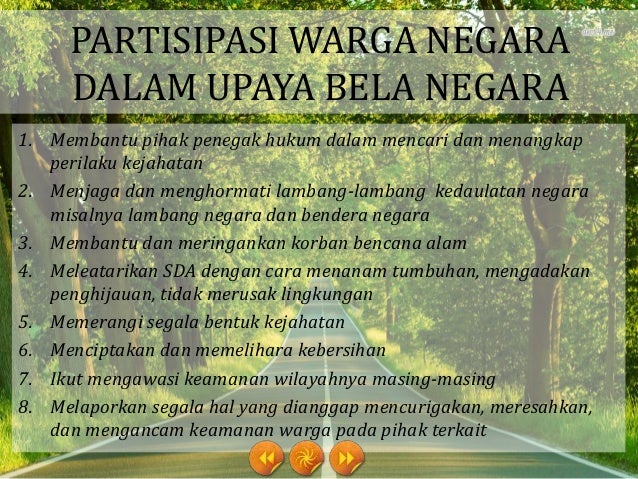 Bela negara dalam sisdiknas. Usaha pembelaan pada negara selain kewajiban dasar setiap warga negara juga adalah suatu kehormatan bagi setiap warga negara yang dilaksanakan dengan penuh kesadaran tanggung jawab dan rela berkorban dalam pengabdian kepada bangsa dan negara. Dengan demikian partisipasi warga negara dalam membela lingkungan tidak lain merupakan bagian dari usaha pembelaan negara. Usaha pembelaan negara tentu melibatkan seluruh warga negara. Bela negara pengertian pentingnya fungsi tujuan manfaat unsur bentuk dasar hukum contoh. Warganegara dan negara 1.