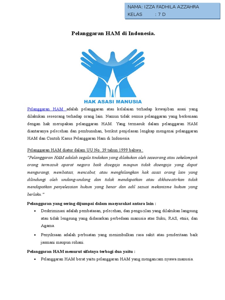 Berikut dibawah ini beberapa contoh kasus pelanggaran ham di indonesia. Kasus pelanggaran ham jika berbicara mengenai kasus pelanggaran ham di indonesia pasti yang terlintas pertama kali adalah hilangnya beberapa aktivis di era orde baru atau kerusuhan mei 98peristiwa tersebut sangat membekas di pikiran orang yang ditinggalkan bahkan beberapa ada yang belum jelas kasusnya. Contoh kasus pelanggaran ham sebenarnya sangat dekat dengan kehidupan anda. Pelanggaran hak asasi manusia merupakan suatu istilah yang merujuk pada tindakan merampas atau menghancurkan hak hak dasar manusia seperti hak hidup dan hak atas kebebasan. Sekita tahun 1984 pernah terjadi sebuah penembakan serta beberapa bentuk kekerasan massal yang pernah dilakukan oleh aparat serta warga sekitar. Pergolakan politik konflik etnis dan penguasa diktator dapat menyulut terjadinya pelanggaran ham.