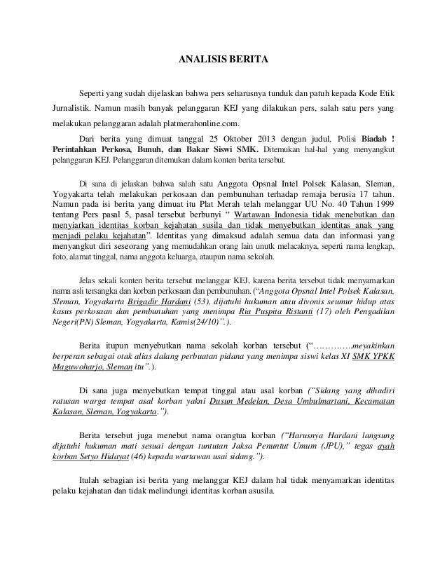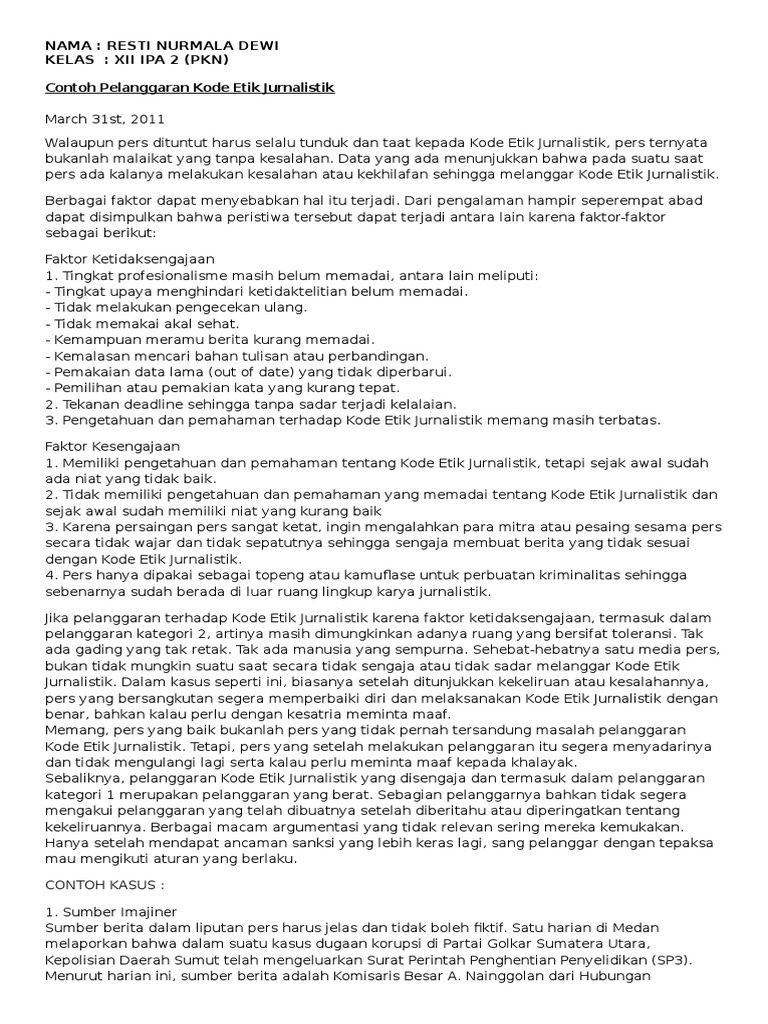 Direksi kata bosco akan memberi sanksi kepada wartawannya jika terbukti terlibat menghalangi proses hukum kasus ketua dpr ri setya novanto. Sanksi atas pelanggaran kode etik jurnalistik dilakukan oleh organisasi wartawan dan atau perusahaan pers. Identitas dan foto korban susila anak anak dimuat sesuai dengan asas moralitas menurut kode etik jurnalistik masa depan anak anak harus dilindungi. Hal ini jelas merupakan pelanggaran bagi kode etik jurnalistik kej yang dalam pasal pasalnya menyebutkan bahwa wartawan indonesia menghasilkan berita yang akurat menghasilkan berita faktual dan jelas sumbernya pengambilan gambar foto suara dilengkapi sumber tidak melakukan plagiat dan selalu menguji informasi. Kode etik jurnalistik dan contoh kasus. Disini telah terjadi pelanggaran kode etik sesuai pasal 4 yaitu jurnalis berbohong.