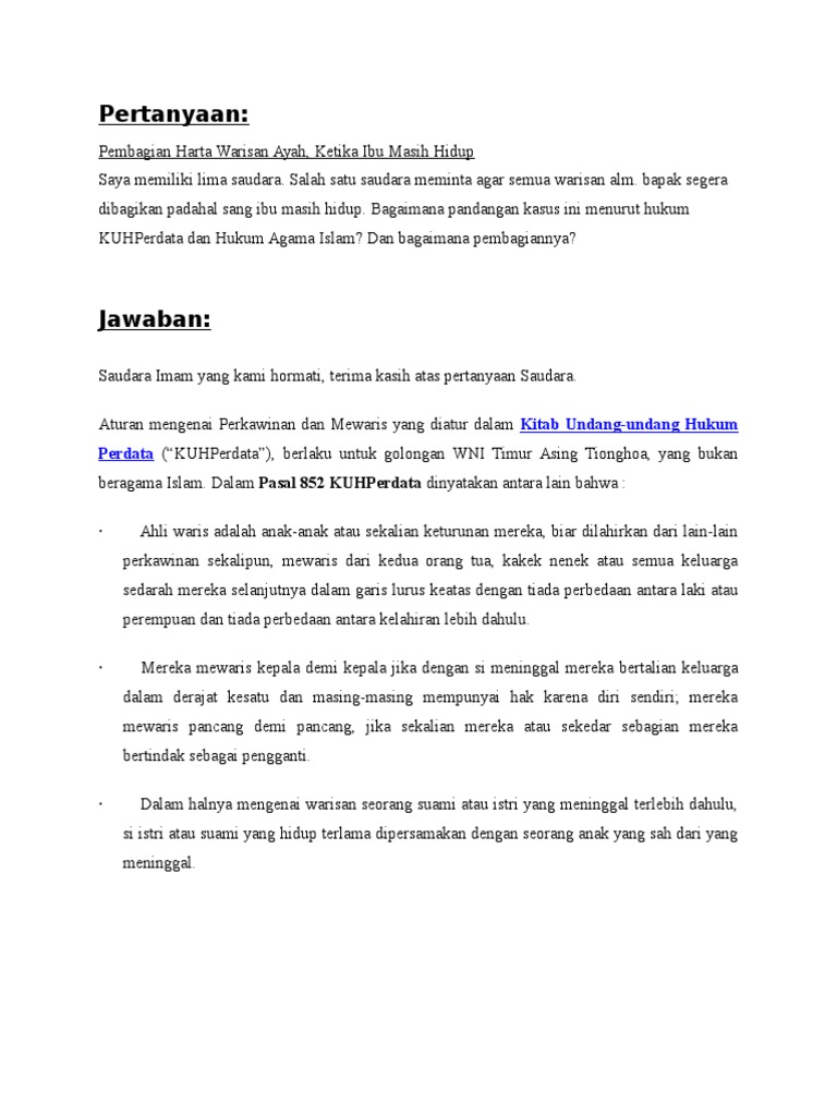 Hukum kewarisan menurut hukum islam sebagai salah satu bagian dari hukum kekeluargaan al ahwalus syahsiyah sangat penting dipelajari agar supaya dalam pelaksanaan pembagian harta warisan tidak terjadi kesalahan dan dapat dilaksanakan dengan seadil adilnya sebab dengan mempelajari hukum kewarisan islam maka bagi ummat islam akan dapat menunaikan hak hak yang berkenaan dengan harta warisan. Cucu laki laki dari anak laki laki 3. 1 setengah ada lima ahli waris yang berhak mendapatkan separuh dari harta waris peninggalan pewaris. Seperti yang dikutip dari buku berjudul pembagian warisan menurut islam oleh muhammad ali ash shabuni jumlah pembagian yang ditentukan al quran ada 6 macam yaitu. Dalam masalah pembagian harta waris terdapat beberapa kasus yang tergolong biasa dan tergolong khusus untuk kasus pembagian waris yang tergolong biasa tidak begitu rumit menghitungnya dikarenakan harta waris tidak ada yang tersisa atau pun kurang sebaliknya dengan kasus khusus sesuai namanya perlu pertimbangan dan kondisi khusus yang menyebabkan permbagian harta waris berbeda dengan kasus biasa. 100000000 tersebut dibagi menjadi 8 bagian di mana masing masing bagian senilai rp.