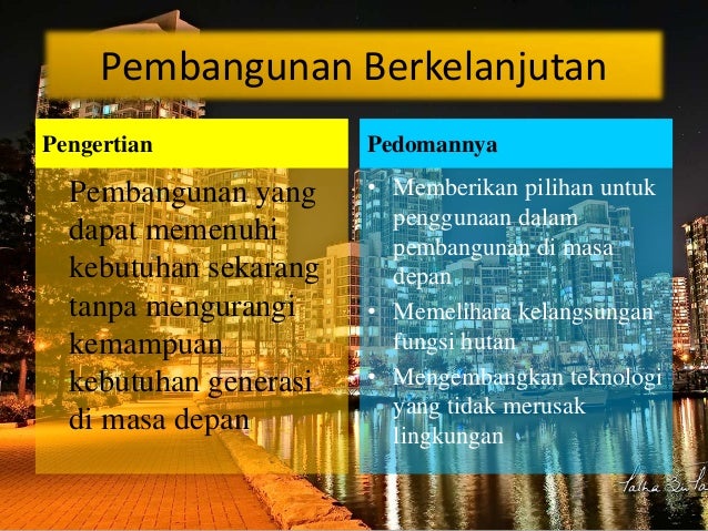 Pembangunan berkelanjutan ialah pembangunan yang memenuhi kebutuhan sekarang tanpa harus mengurangi kemampuannya untuk memenuhi kebutuhan generasi yang akan datang. Baca juga artikel yang mungkin berhubungan. Kawasan ini dikembangkan di atas lahan seluas 240 hektar. Istilah berkelanjutan berasal dari bahasa inggris yaitu sustainability. Pengertian pembangunan berwawasan lingkungan kriteria prinsip hakikat tujuan masalah. 5 contoh pembangunan berkelanjutan.