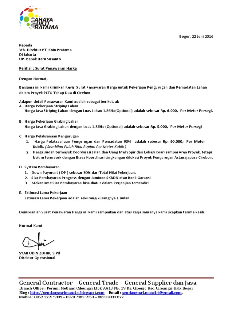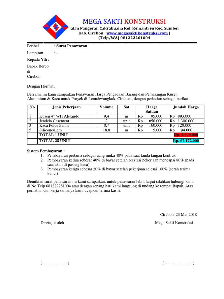Contoh penawaran harga proyek. Contoh surat penawaran kerjasama surat penawaran kerjasama sangat sering digunakan dalam lingkup perusahaan baik perusahaan yang besar maupun kecil. Contoh surat penawaran surat penawaran yaitu surat yang ditulis guna menyampaikan maksud suatu perusahaan untuk menjalin kerjasama dengan perusahaan lainnya. Membuat penawaran yang baik dan benar serta menarik perhatian adalah impian dari semua orang. Surat penawaran seringkali berbentuk formal dan dengan jelas juga mencantumkan rincian harga juga barang yang ditawarkan akan dijual. Umumnya surat penawaran digunakan oleh perusahaan perusahaan penyaluran dalam hal ini distributor. Pada artikel kali ini kita akan membahas mengenai contoh surat penawaran barang dan harga lengkapsebagai informasi surat penawaran barang dan hargaadalah surat yang dibuat dan ditujukan kepada suatu perusahaan yang tujuannya yaitu untuk menawarkan suatu barang atau produk ke perusahaan tersebut beserta detail harganya.