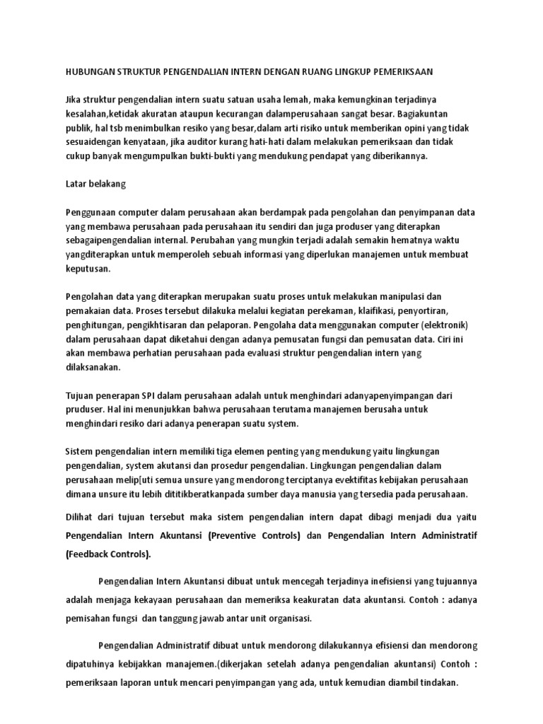 Contoh pengendalian internal pada perusahaan. Istilah tersebut merujuk pada proses di dalam entitas organisasi termasuk perusahaan dipengaruhi oleh dewan komisaris atau dewan pengawas serupa manajemen dan personel lainnya dirancang untuk memberikan jaminan yang layak agar entitas. Pengendalian internal dapat diharapkan untuk menyediakan hanya keyakinan yang memadai bukan keyakinan yang mutlak kepada manajemen dan dewan direksi suatu entitas karena keterbatasan yang melekat dalam semua sistem pengendalian intern dan perlunya untuk mempertimbangkan biaya dan manfaat relatif dari pengadaan pengendalian. Jika komputer yang digunakan sebagai alat bantu pengolahan data akan terjadi pergeseran dari sistem yang berorientasi pada orang ke sistem yang berorientasi pada komputer computer oriented. Sistem pengendalian intern dalam perusahaan yang menggunakan manual system dalam akuntansinya lebih menitikberatkan pada orang yang melaksanakan sistem tersebut people oriented. Auditor internal dapat melaporkan masalah masalah dan hal hal yang mendapat perhatian khusus kepada komite audit atau dewan direksi yang independen terhadap manajemen perusahaan. Aktiva dilindungi dan digunakan untuk pencapaian tujuan usaha.