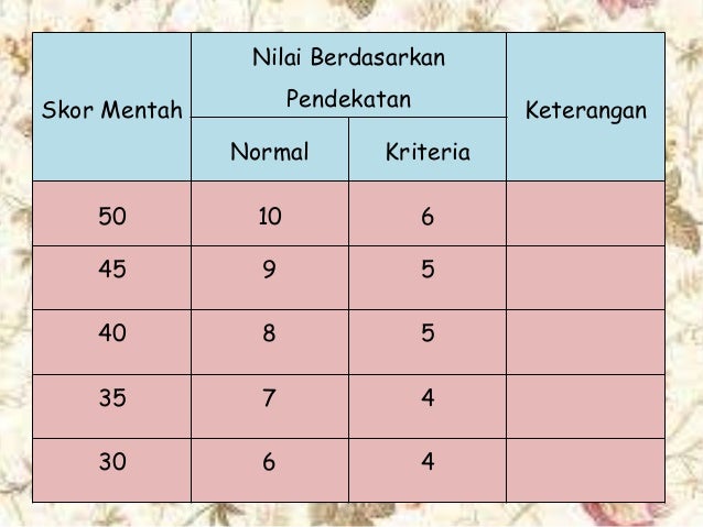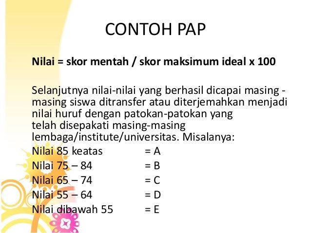 Pedoman konversi yang digunakan dalam pendekatan pan sama dengan pendekatan pap. Yaitu penilaian acuan norma pan dan penilaian acuan patokan pap. Jika menggunakan pendekatan penilaian acuan normal pan maka peserta tes yang mendapat skor tertinggi 50 akan mendapat nilai tertinggi misalnya 10. Hasil evaluasi tersebut tertuang dalam nilai. 26 januari 2012 pukul 143 am ciri pap penafsiran skor dari alat pengukuran yang dapat menghasilkan deskripsi tentang kemampuan atau pengetahuan yang dimiliki oleh peserta didik syarat pap. Nurhasan 2000317 menjelaskan sebagai berikut.
