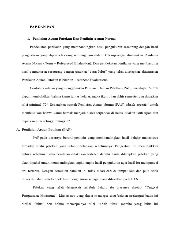 Contoh penilaian pan dan pap. Nurhasan 2000317 menjelaskan sebagai berikut. Selanjutnya penilaian acuan patokan disebut dengan pap dan penilaian acuan norma disebut dengan pan. Menurut bambang dan sunarni 1 penilaian acuan patokan adalah penilaian yang dalam menginterpretasikan hasil pengukuran secara langsung didasarkan standar performansi tertentu yang ditetapkan sebelumnya yang disesuaikan dengan tujuan instruksional pendidikan. Perbedaannya hanya terletak dalam menghitung rata rata dan simpangan baku. Evaluasi ini menitik beratkan pada status individu siswa dalam kelompok. Dianggap tidak adil.