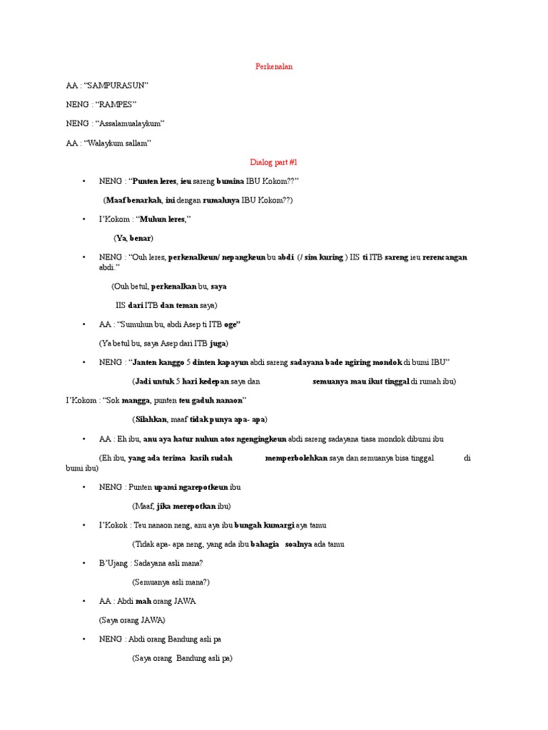 Contoh percakapan bahasa sunda dan artinya. Percakapan percakapan berikut menggunakan bahasa yang sering digunakan masyarakat sunda dalam keseharian beberapa diantaranya ada yang menggunakan bahasa yang sedang ada juga bahasa sunda yang halus. Perkenalan bahasa sunda dalam pelajaran di sekolah kita tentunya pernah mendapatkan tugas dari guru tentang cara bagaimana memperkenalkan diri atau wawanohan dengan menggunakan bahasa sunda yang baik dan benar di depan kelas. Belajar bahasa sunda sebagian besar penduduk di jawa barat menggunakan bahasa sunda dalam percakapan sehari hari. Belajar bahasa sunda penting sekali untuk kamu yang ingin atau akan tinggal di lingkungan yang mayoritas penduduknya berbahasa sunda baik itu sekolah maupun bekerja dan lain. 5 nama anggota keluarga dalam bahasa sunda dan artinya. 6 contoh kalimat percakapan.