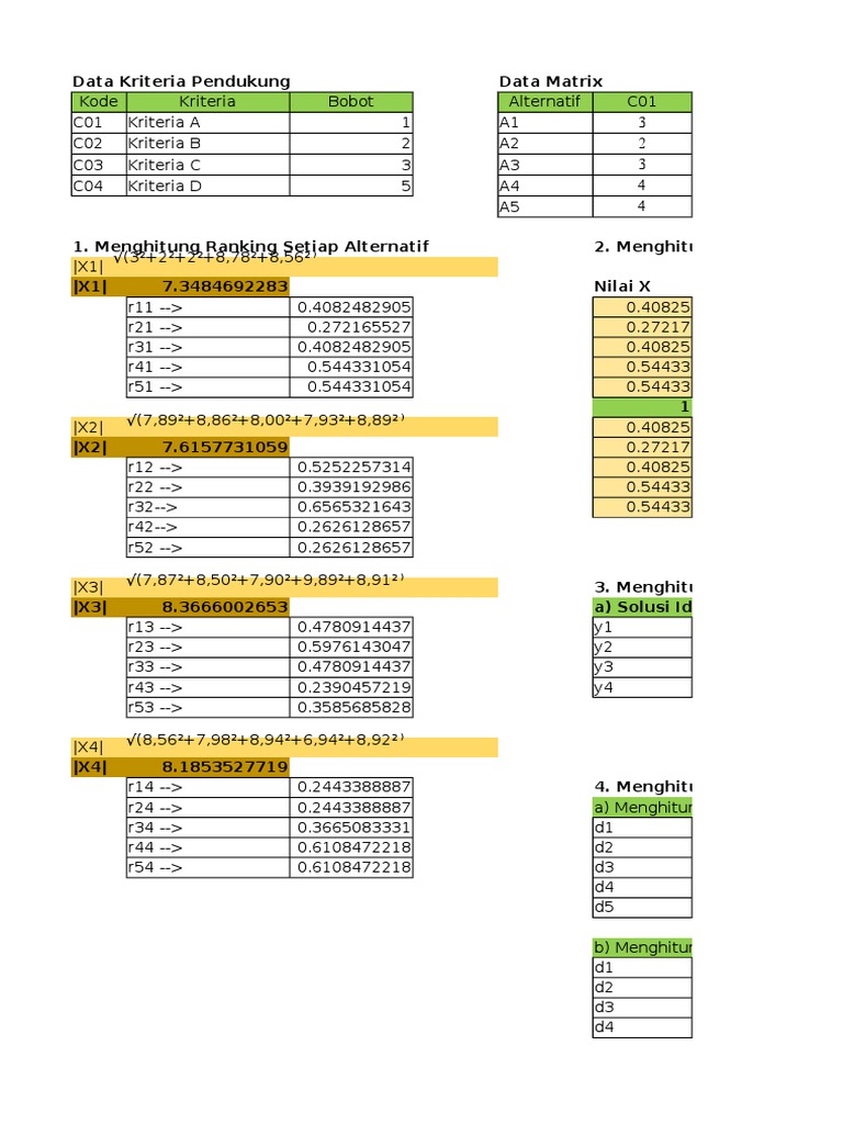 Contoh perhitungan metode topsis. Sekolah menengah kejuruan smk negeri 1 boyolali sedang melakukan proses seleksi pemilihan guru teladan dengan mengolah hasil nilai terhadap tiga guru. 2006 topsis didasarkan pada konsep dimana alternatif terpilih yang terbaik tidak hanya memiliki jarak terpendek dari solusi ideal positif namun juga memiliki jarak terpanjang dari solusi ideal negatif dari sudut. Topsis technique for others reference by similarity to ideal solution adalah salah satu metode pengambilan keputusan multikriteria yang pertama kali diperkenalkan oleh yoon dan hwang 1981topsis menggunakan prinsip bahwa alternatif yang terpilih harus mempunyai jarak terdekat dari solusi ideal positif dan terjauh dari solusi ideal negatif dari sudut pandang geometris dengan menggunakan. Sebagai contoh dari hasil penelitian telah ditentukan nilai kriteria sebagai berikut. Topsis menggunakan prinsip bahwa alternatif yang terpilih harus mempunyai jarak terdekat dari solusi ideal positif dan jarak terpanjang terjauh dari solusi ideal negatif dari sudut pandang geometris dengan menggunakan jarak euclidean jarak antara dua titik untuk. Topsis adalah salah satu metode pengambilan keputusan multikriteria yang pertama kali diperkenalkan oleh yoon dan hwang 1981.