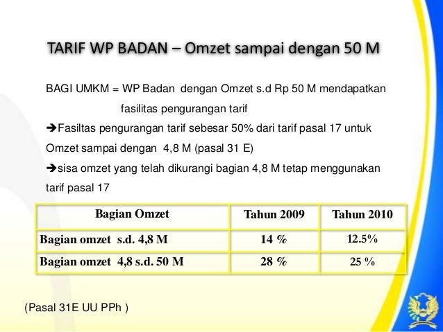 Pertama badan usaha yang memiliki pendapatan bruto sampai rp48 miliar per tahun atau sering disebut usaha mikro kecil dan menengah umkm berdasarkan peraturan pemerintah nomor 23 tahun 2018 dikenakan tarif pajak pph final yaitu pph pasal 4 ayat 2 dengan perhitungan pajak 05 dikalikan dengan seluruh pendapatan bruto dari hasil usaha. Fasilitas pasal 31e bukan merupakan pilihan penghitungan pph badan dengan menggunakan fasiltas pasal 31e bagi wajib pajak badan dalam negeri maupun bentuk usaha tetap bukan merupakan pilihan. Penghasilan sebagaimana dimaksud dalam pasal 31e ayat 1 undang undang pajak penghasilan.