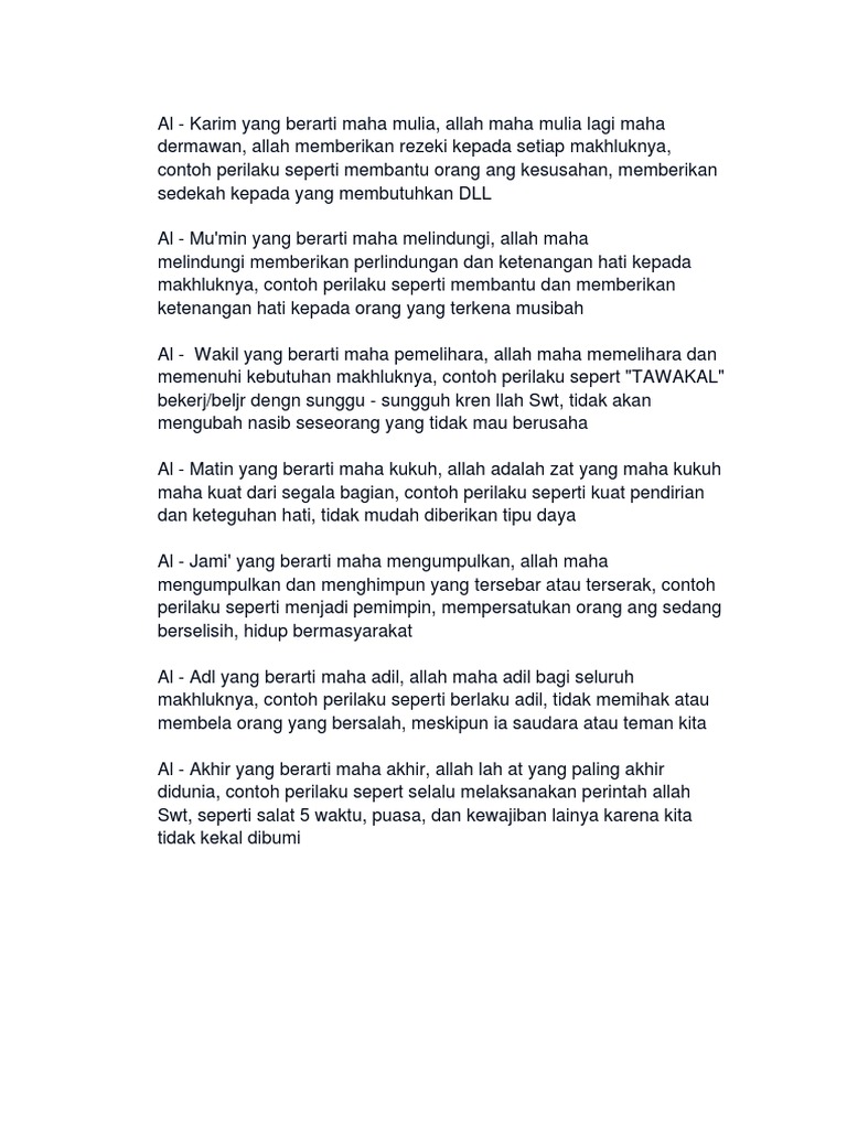 Beberapa contoh perilaku yang sesuai dalam kehidupan sehari hari antara lain. Makna asmaul husna al wakil. Cara kita megamalkan asma al wakil dalam kehidupan yaitu dengan cara. Selain itu contoh perilaku sehari hari yang berkaitan dengan al jami adalah m engajak orang untuk sholat berjamah dan m enjaga pergaulan dengan baik. Contoh perilaku al karim maha pemurah gemar bersedekah dan berinfak menyumbangkan pakaian layak pada korban bencana alam membantu dan menolong orang lain yang membutuhkan. Al wakil yang maha mewakili atau pemelihara yaitu allah swt.