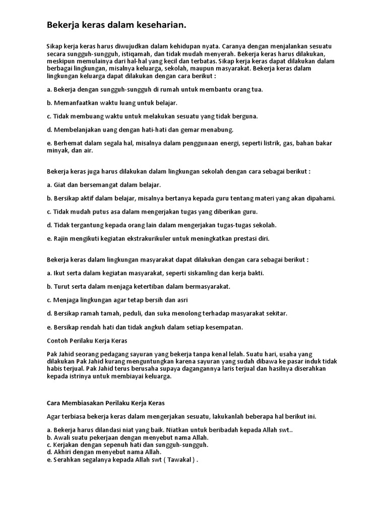 Pengertian dan contoh kerja keras kerja keras dapat diartikan melakukan sesuatu dengan sungguhsungguh untuk mencapai sesuatu yang diinginkan atau dicita citakan. Contoh perilaku kerja keras kisah seorang perempuan super karena beliau adalah satu satunya perempuan diantara 280 laki laki yang menempati mabna ibnu kholdun salah satu unit hunian yang ada di mahad sunan ampel al aly uin maulana malik ibrahim malang. Ali duduk di kelas vii sekolah menengah pertama di daerahnya. Ayat ayat al quran tentang kerja keras karena dengan bekerja kita menunjukkan usaha kita untuk mendapatkan rezeki sebagaimana yang telah diatur oleh allah swt. Semangat meraih keinginan d. Kerja keras dapat dilakukan dalam segala hal mungkin dalam bekerja.