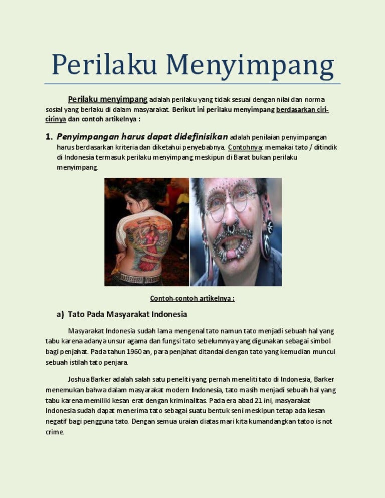Sejauh mana penyimpangan itu terjadi besar atau kecil dalam skala luas atau sempit tentu akan berakibat terganggunya keseimbangan kehidupan dalam masyarakat. Contoh perilaku penyimpangan sosial secara singkat dapat kita lihat dalam kehidupan sehari hari seperti orang orang yang melanggar lalu lintas dijalan pencopet berbohong dan berbagai tindak kejahatan serta masih banyak contoh yang lainnya. Perilaku penyimpangan sosial ini biasa dilakukan secara individu maupun kelompok. Cohen ukuran yang menjadi dasar adanya penyimpangan bukan baik atau buruk benar atau salah menurut pengertian umum melainkan berdasarkan ukuran norma dan nilai sosial suatu masyarakat. Perilaku menyimpang membutuhkan keriteria atau ciri ciri tetentu agar bisa dikatakan menyimpang. Contoh penyimpangan sosial pengertian penyimpangan sosial adalah perilaku yang tidak sesuai dengan norma dan nilai niali kesusilaan baik dalam sudut pandang kemanusiaan dan agama secara individu maupun secaraa kelompok sebagai bagian daripada makhluk sosial.