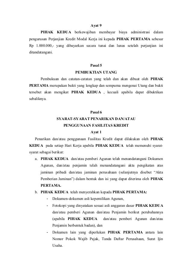 Apabila perjanjian kredit telah ditandatangani namun fasilitas kredit tidak digunakan oleh debitor atau utang menjadi jatuh waktu karena sebab yang tercantum dalam pasal 14 ayat 3 perjanjian kredit atau terjadi kejadian sebagaimana diuraikan dalam pasal 18 ayat 3 perjanjian kredit maka pt. Apabila fasilitas kredit ini dipergunakan tidak sesuai dengan keperluannya seperti yang tersebut di atas maka bank berhak secara sepihak untuk menghentikan perjanjian kredit ini dan debitur diwajibkan untuk membayar seluruh utangnya berikut bunga provisi denda denda dan biaya biaya lainnya dengan seketika dan sekaligus lunas dengan ketentuan bilamana. Yang dimaksud dengan jumlah utang dalam perjanjian kredit ini ialah semua jumlah uang yang sewaktu waktu terutang oleh peminjam kepada bank berdasarkan perjanjian kredit ini termasuk setiap penambahan perubahan pembaruan dan penggantiannya baik utang pokok bunga ongkos dan biaya bea meterai dan pajak ongkos pengacara untuk menagih utang dan pelaksanaan perjanjian jaminan yang berkenaan. Penarikan penarikan atas jumlah jumlah uang oleh peminjam di bawah perjanjian kredit ini setelah syarat syarat mengenai jaminan seperti tertera dalam pasal 17 di bawah ini dipenuhi secara memuaskan bagi bank dapat dilakukan oleh peminjam secara sekaligus atau bertahap pada hari kerja bank dengan pemberitahuan hari di muka dengan ketentuan bahwa dalam jangka waktu. Contoh surat perjanjian kredit bank contoh surat perjanjian kredit bank hallo sahabat pada artikel yang anda baca kali ini dengan judul contoh surat perjanjian kredit bank kami telah mempersiapkan artikel ini dengan baik untuk anda baca dan ambil informasi didalamnya. Kredit merupakan seseorang untuk membeli atau juga melakukan pinjaman dengan cara melakukan perjanjian dalam pembayaran yang sesuai dengan jangka waktu tertentu.