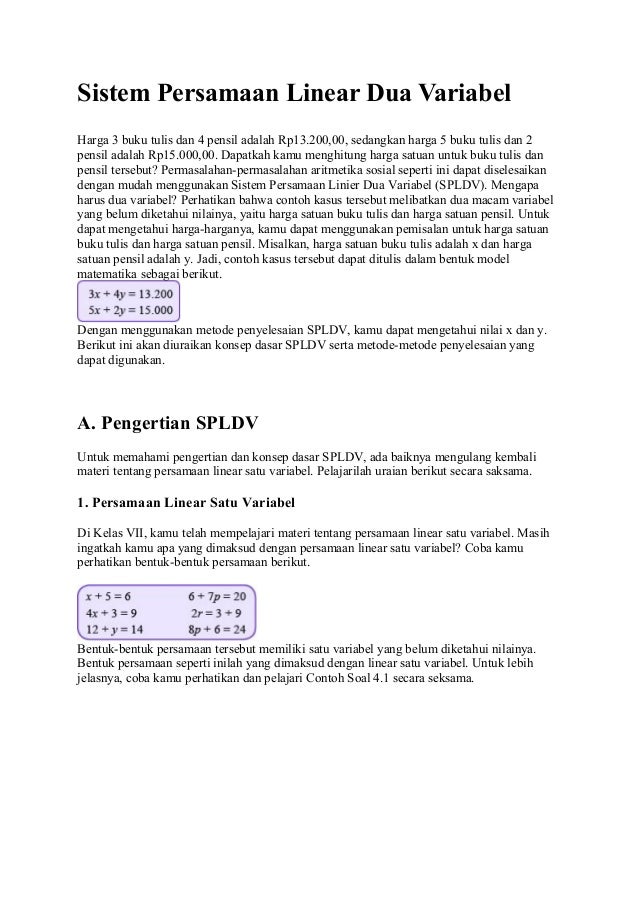 Persamaan linear dua variabel contoh soal spldv sistemnya dosenpendidikancom persamaan linear adalah sebuah persamaan aljabar yang tiap sukunya mengandung konstanta atau perkalian konstanta dengan variabel tunggal. Atau. Sistem persamaannya bisa terdiri dari satu variabel dua variabel atau lebih.