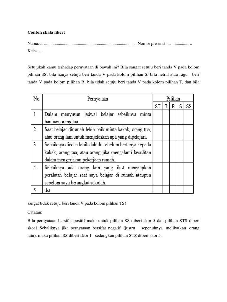 Skala likert adalah suatu skala psikometrik yang umum digunakan dalam kuesioner dan merupakan skala yang paling banyak digunakan dalam riset berupa surveinama skala ini diambil dari nama rensis likert yang menerbitkan suatu laporan yang menjelaskan penggunaannyasewaktu menanggapi pertanyaan dalam skala likert responden menentukan tingkat persetujuan mereka terhadap suatu pernyataan dengan. Skala likert merupakan metode skala bipolar yang mengukur baik tanggapan positif ataupun negatif terhadap suatu pernyataan. Berikut ini disajikan contoh kuesioner lengkap yang dibuat oleh indah prihatiningsih dari fakultas teknik universitas brawijaya malang.