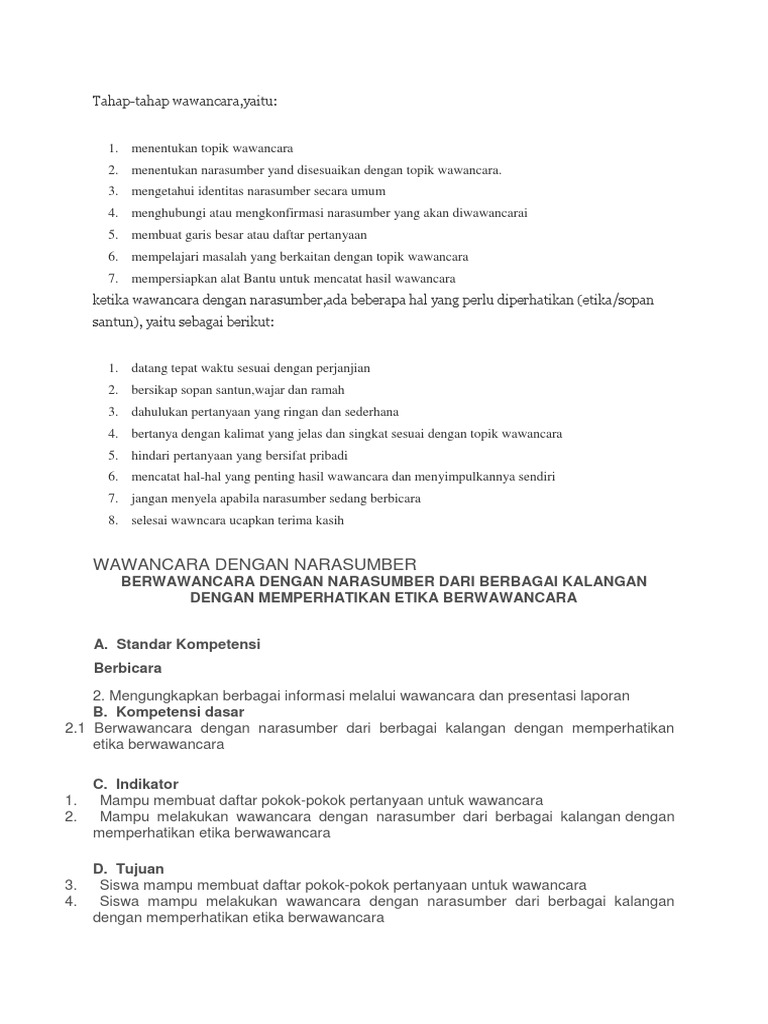 Contoh pertanyaan wawancara dengan narasumber. Berikut ini adalah sejumlah pertanyaan dan contoh dalam wawancara yang singkat pertanyaan dan contoh ini dilakukan atas tanggapan pengunjung di salah satu wisata yang ada di kota yogjakarta. Wawancara kerja job interview merupakan tahapan yang harus dilalui oleh mereka yang sedang mencari pekerjaan atau mendapatkan pekerjaan barutak heran tahapan ini sering membuat deg degan atau stres bagi mereka yang akan menghadapinya. Contoh wawancara menurut kamus besar bahasa indonesia wawancara adalah proses tanya jawab lisan antara dua orang atau lebih secara langsung. Biasanya wawancara dilakukan dengan mengajukan beberapa pertanyaan seputar bidang yang dikuasai oleh narasumber tersebut. Contoh laporan hasil wawancara laporan hasil wawancara adalah sebuah teks tertulis yang melaporkan suatu wawancara yang telah dilakukan baik itu wawancara dengan pedagang pengusaha guru ketua rt. 5w 1h yaitu singkatan dari.